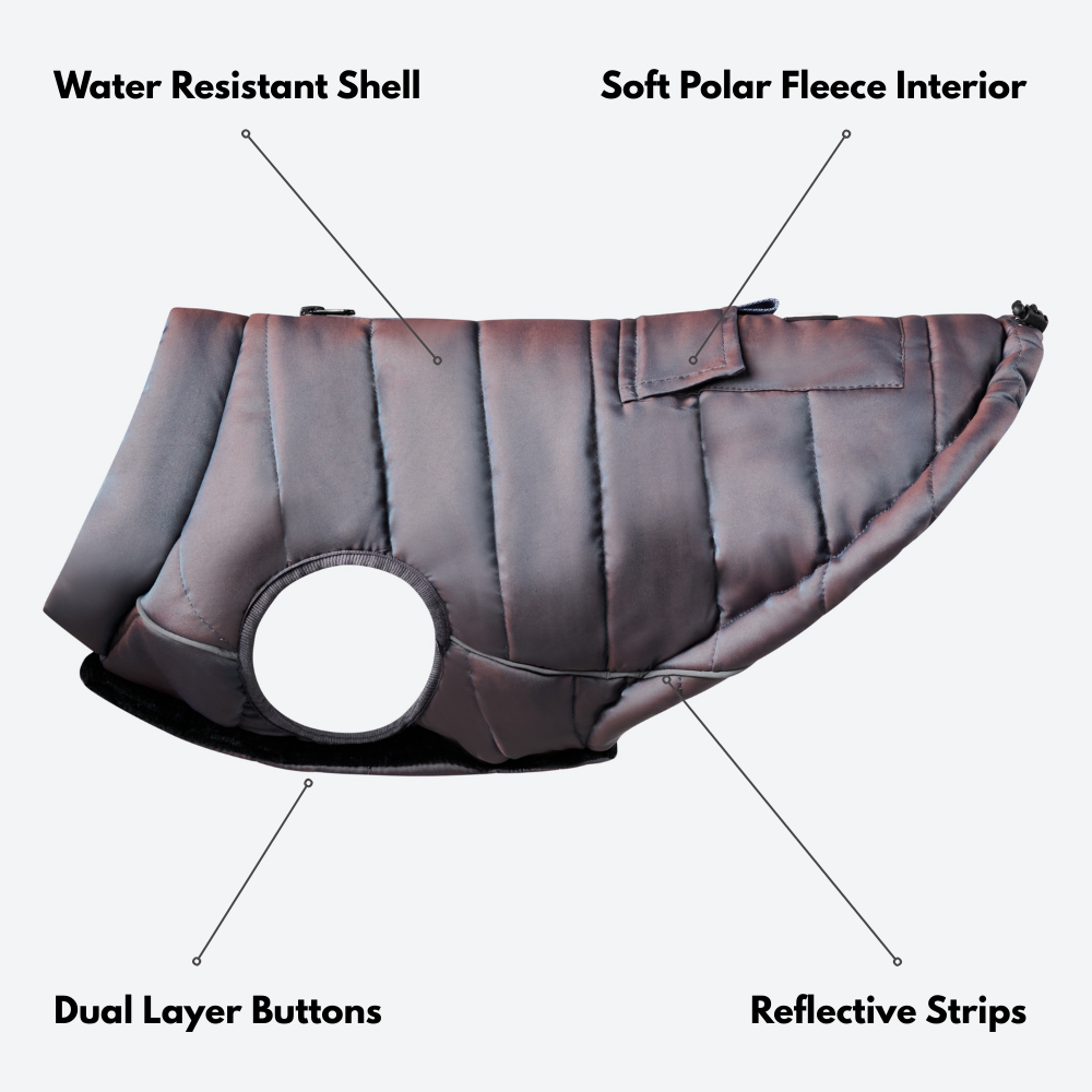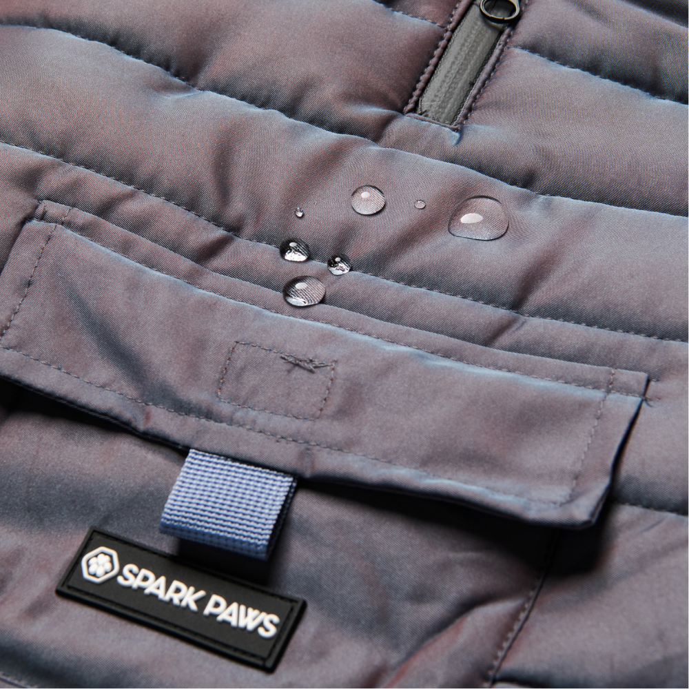 This sleek tech-wear inspired parka will keep your dog dry and warm on the coldest winter days.