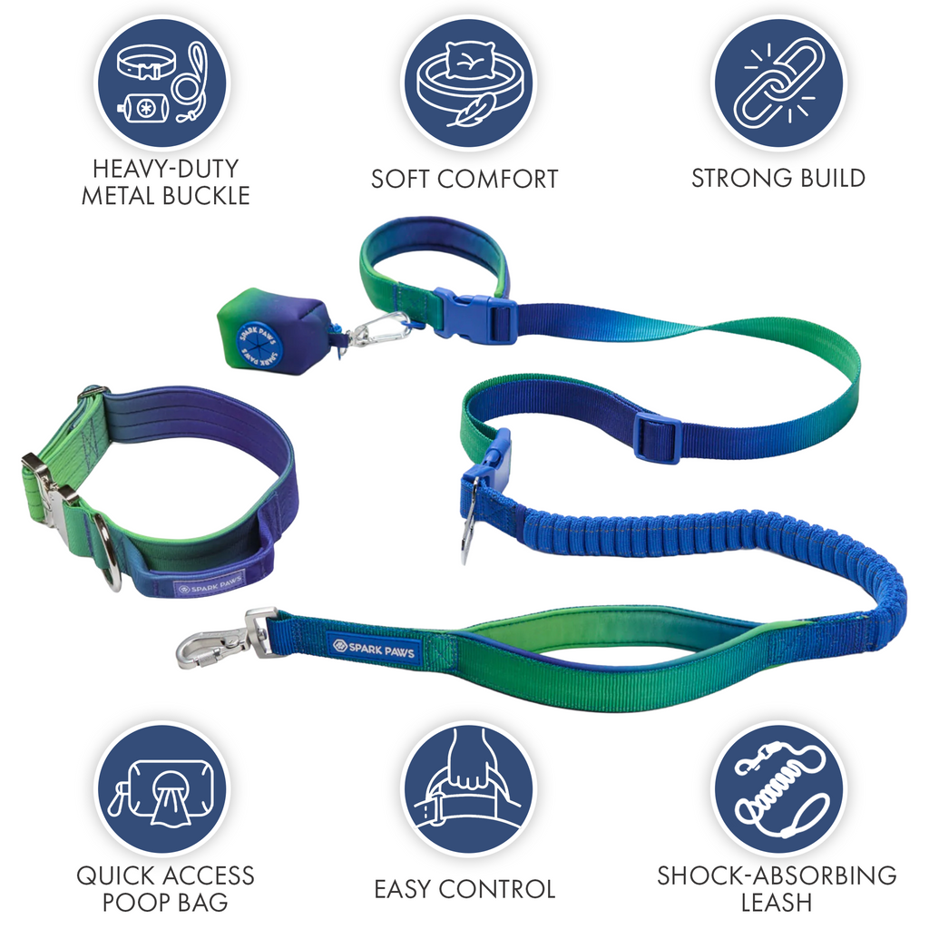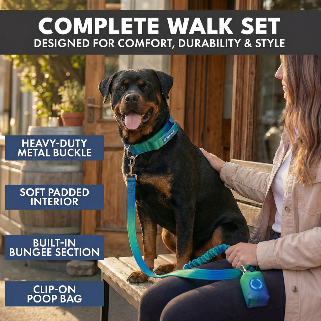 Iedere set bevat een Tactische Hondenhalsband, bijpassende Neopreen Hondenlijn en een Poepzakhouder.
