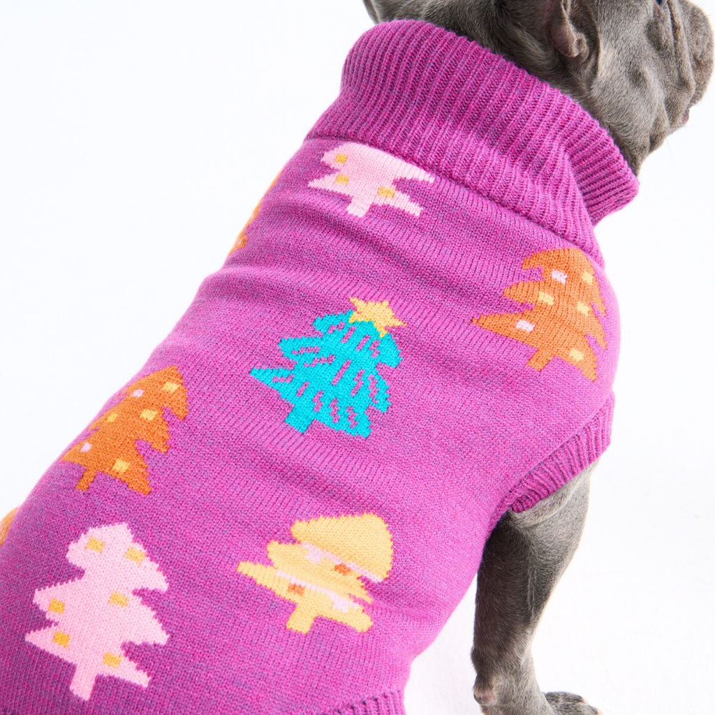 Gebreide kersttrui voor honden – Magenta snoepbomen